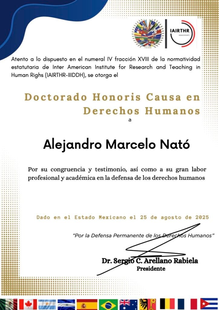 El Dr. Alejandro Nató fue distinguido con el Doctorado Honoris Causa en Derechos Humanos otorgado por el Inter American Institute for Research and Teaching in Human Rights (IAIRTHR).