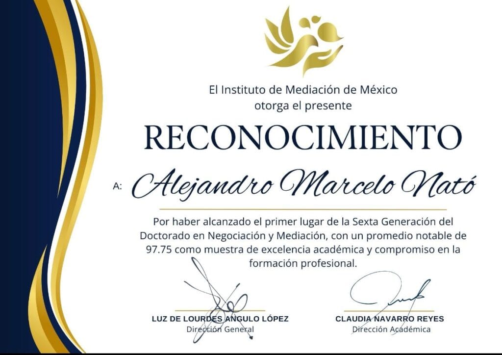 El Instituto de Mediación de México ha otorgado un reconocimiento al Dr. Alejandro Nató por haber obtenido el primer lugar de la Sexta Generación del Doctorado en Negociación y Mediación.